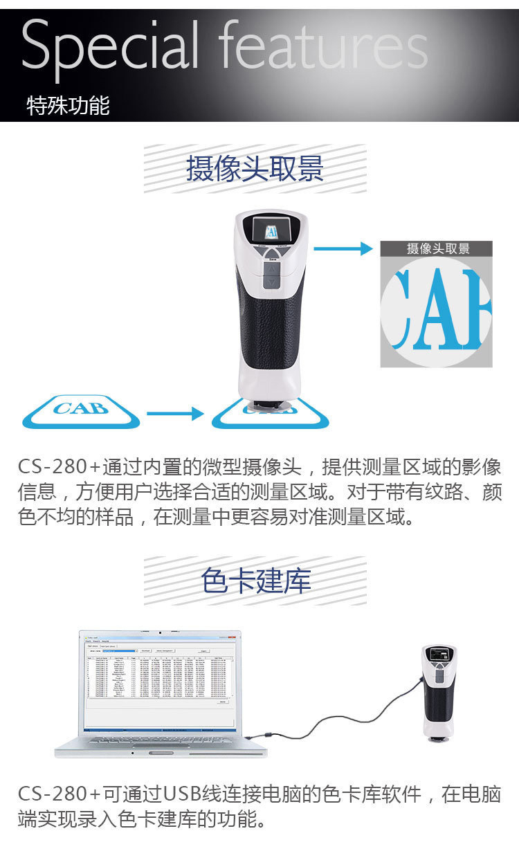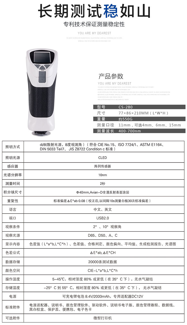 分光式色差儀CS-280采用分光式原理測量顏色色差,廣泛應(yīng)用于塑膠、印刷、油漆油墨、紡織、印染服裝等行業(yè)的顏色管理*域,根據(jù)CIE色空間測量樣品色值L*a*b、L*c*h,與被測樣品的色差△E以及 △Lab值。