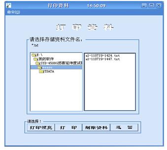 點(diǎn)擊打印窗體文件選擇列表框中選取文件名(文件名以樣品編號(hào)命名),點(diǎn)擊本窗體的刪除資料按鈕,將刪除以前所存儲(chǔ)的該樣品的測(cè)試資料。