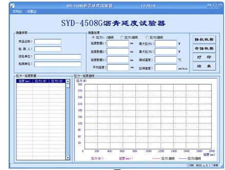 ⑵ 上位機(jī)保存試驗(yàn)結(jié)果并畫出拉力曲線:將上位機(jī)與主機(jī)之間的RS232串口連線連好,運(yùn)行配套光盤中的“SYD-4508G瀝青延度試驗(yàn)器.exe”文件,軟件操作方法詳見“五、計(jì)算機(jī)軟件安裝及操作”。