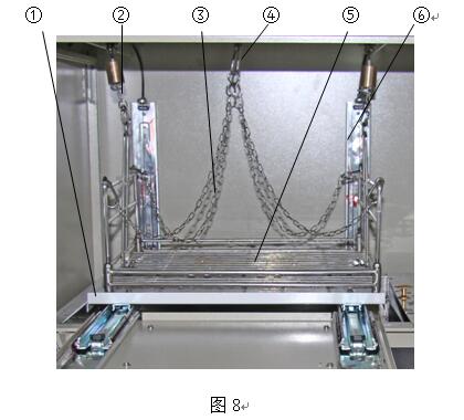 ⑵ 推動上活動托板,讓車轍試件置于電子天平正下方,將方形網(wǎng)籃上的2個帶不銹鋼鏈子的S形掛鉤掛在電子天平下方的保險掛鉤上,見圖8。