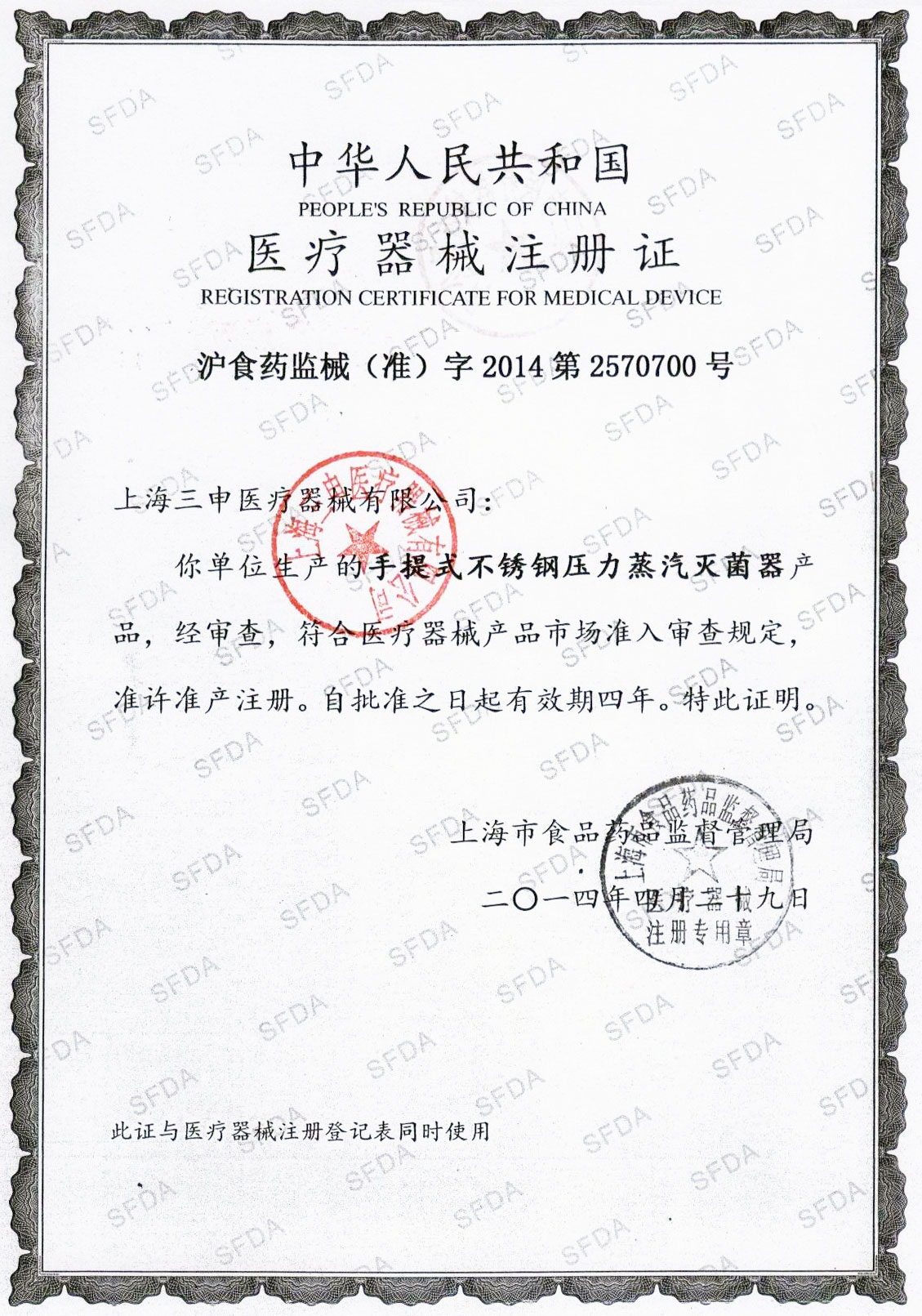- 有醫(yī)療器械產(chǎn)品注冊證和特種設(shè)備制造許可證(壓力容器)